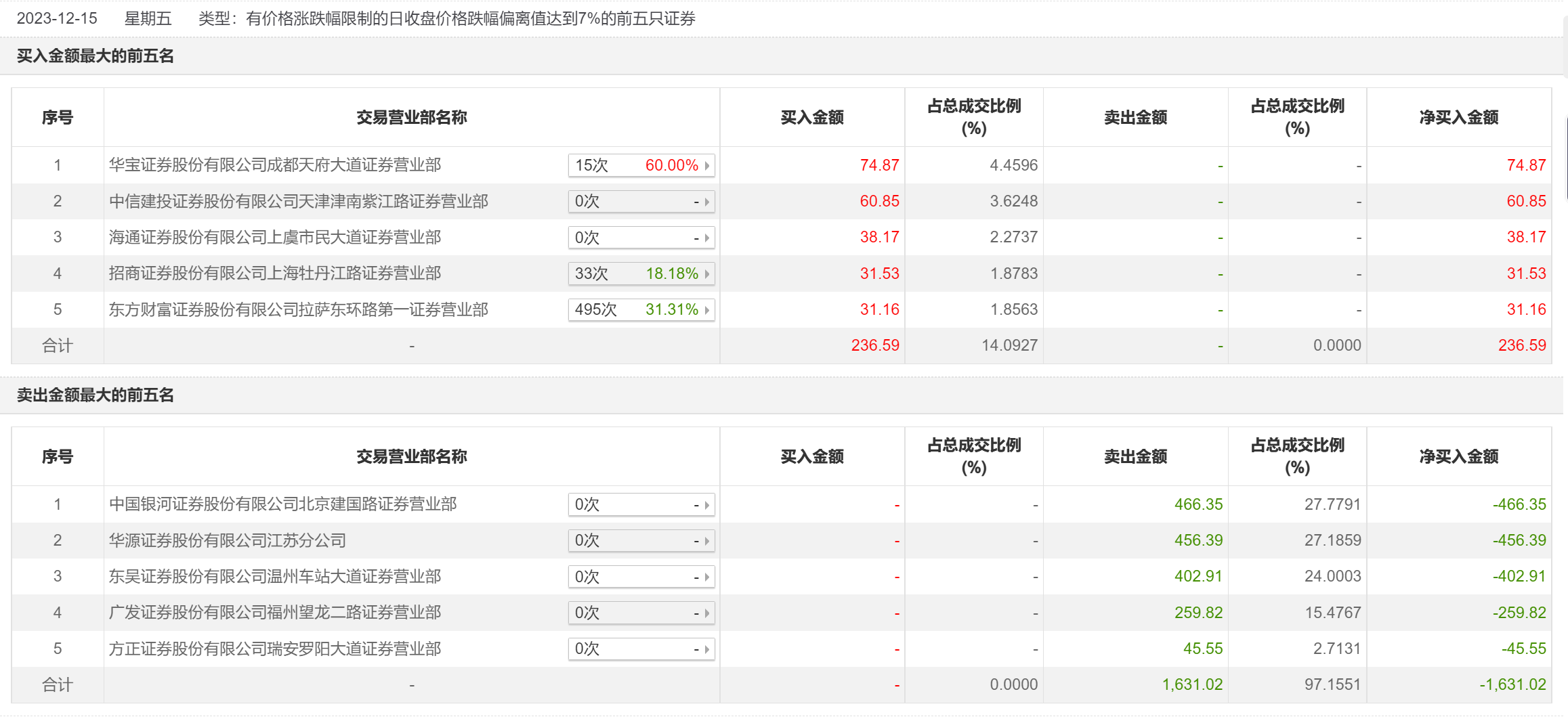 12月15日,雪龙集团今日跌停,全天换手率达0.43%,振幅达0%。龙虎榜数据显示,营业部席位合计净卖出1394.43万元。其中,中国银河证券北京建国路证券营业部、华源证券江苏分公司分别卖出466.35万元、456.39万元;华宝证券成都天府大道证券营业部、中信建投证券天津津南紫江路证券营业部分别买入74.87万元、60.85万元。