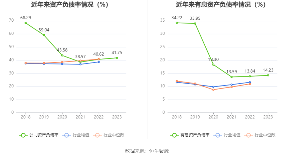 在偿债能力方面,公司2023年年末资产负债率为41.75%,相比上年末上升1.13个百分点;有息资产负债率为14.23%,相比上年末上升0.39个百分点。
