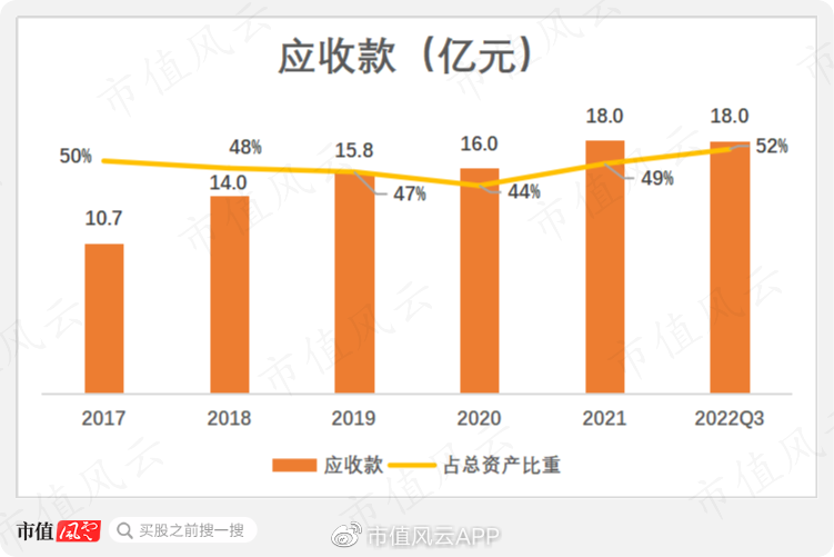 而另外一边,由于行业特性,公司应收款逐年上升,截至2022Q3末,账上有18亿应收款,占总资产比重达52%,应收款的坏账风险始终是悬在公司头上的一把达摩克利斯之剑。