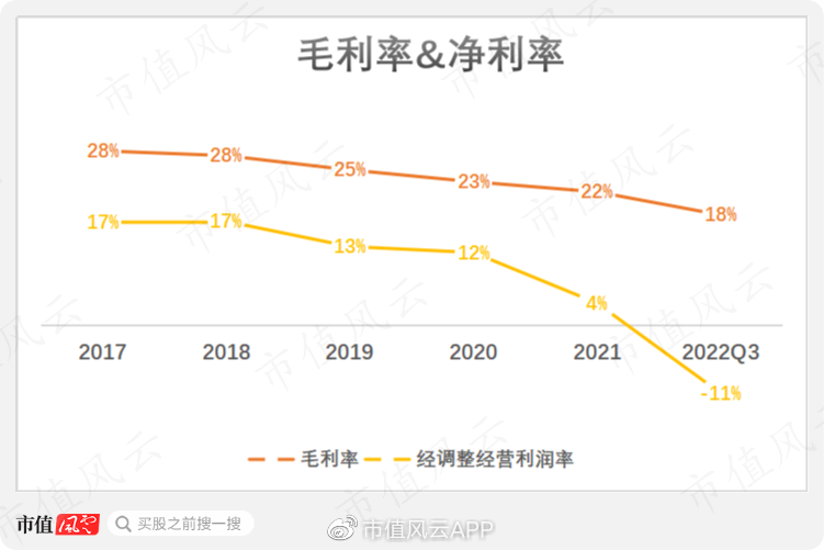 盈利能力方面,毛利率从上市之初的28%降至2022Q3的18%,经调整经营利润率则更惨,2021年仅4%,今年前三季度则是-11%,表明公司当前主业赚钱能力不足。