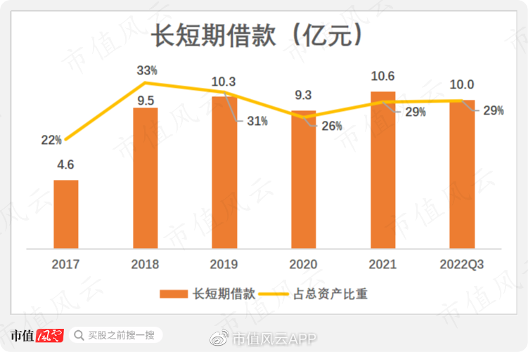 由于高垫资,公司账面上长短期借款持续处于高位,截止到2022Q3末,达到10亿,占总资产比重为29%。