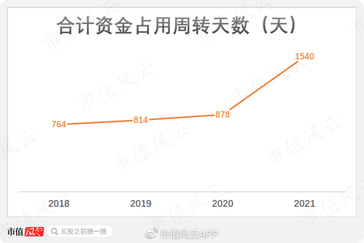 通过计算这些合计资金的周转天数可以发现,公司资金占用到回款的周期在持续上升,2021年达到1540天,运营资金流动性风险已经急剧加大。