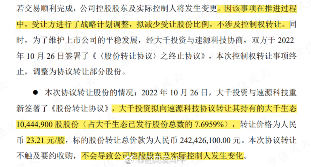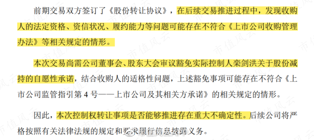 一直到10月27日晚间,事情再现转机:原来的控制权转让计划取消,变更为协议转让部分股份,转让股份为7.6959%,合计2.42亿元,较原计划总金额减半。