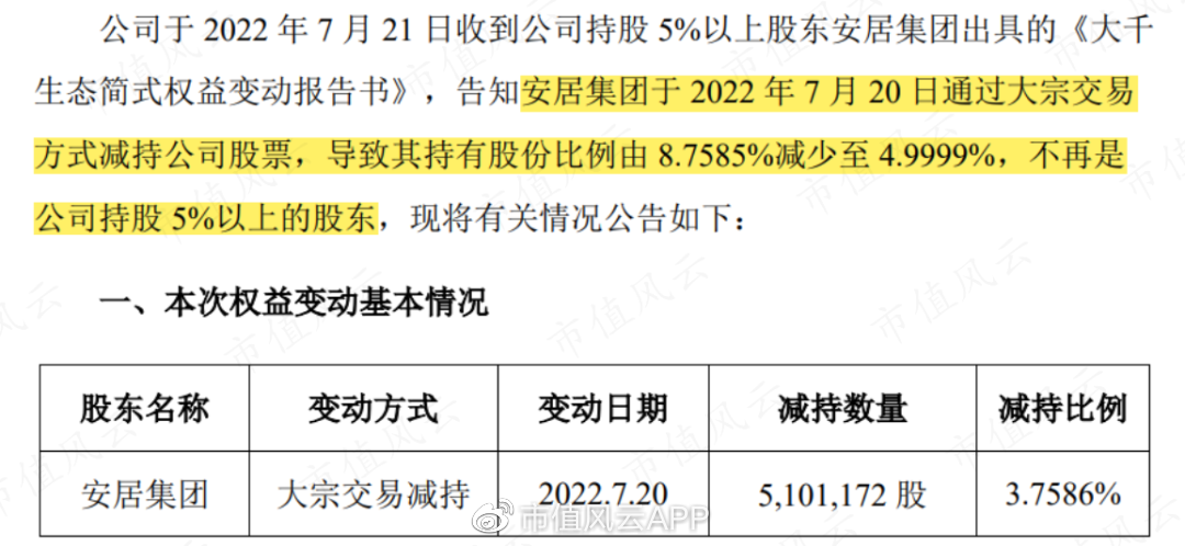 在股价上扬的途中,7月21日盘后,持股8.76%的安居集团公告已通过大宗交易减持股份,减持后持股比达到4.9999%。