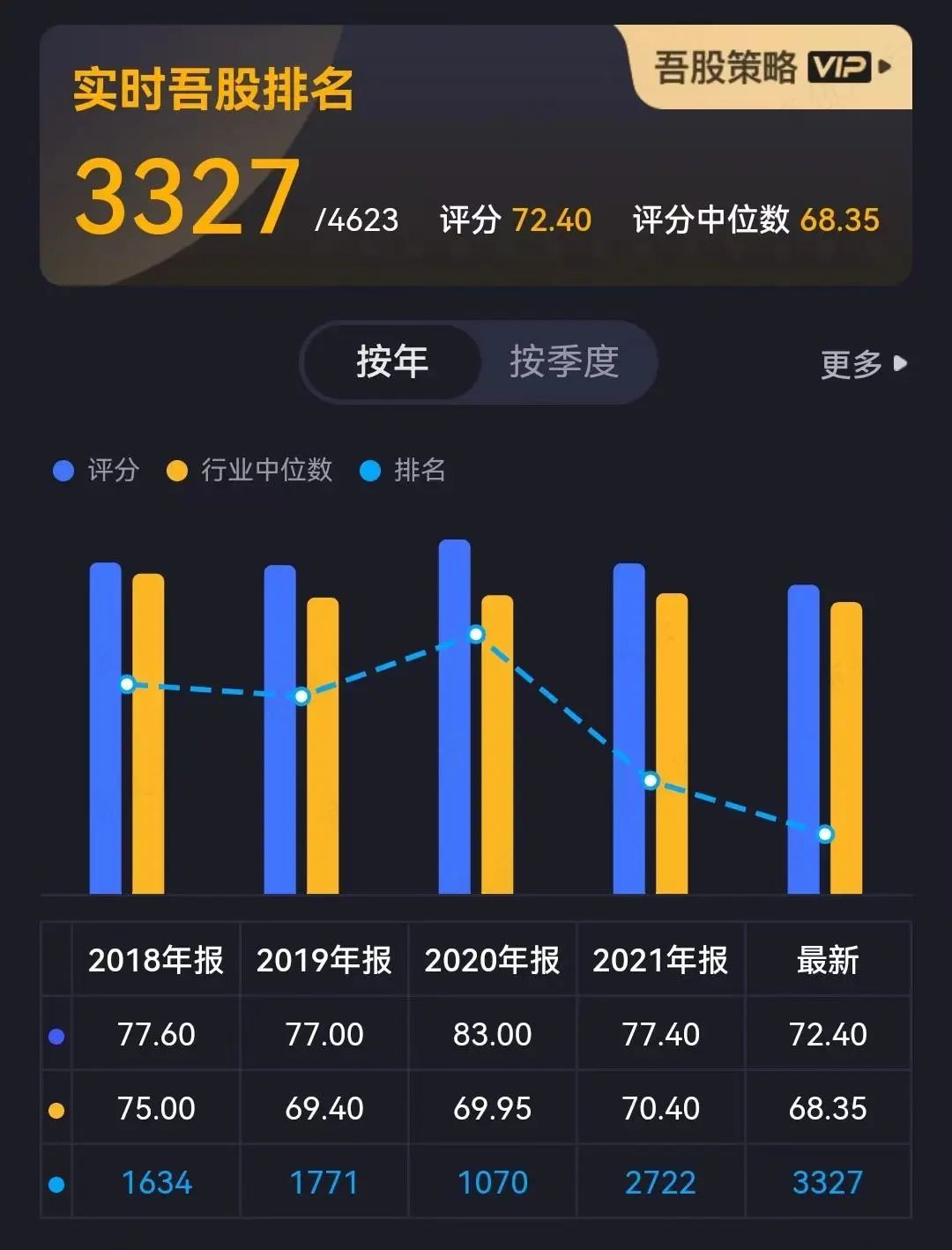 风云君麻利地打开市值风云APP,搜索上市公司的吾股排名,发现公司排名从2018年的1634名掉至当前的3327名。