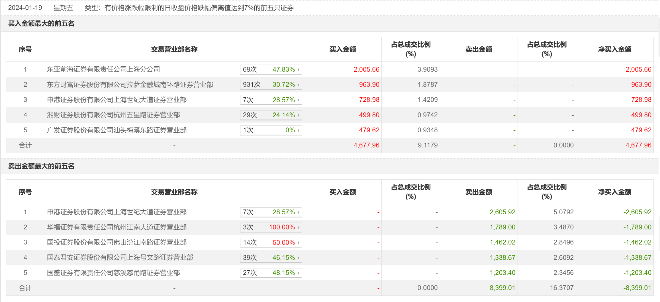 1月19日,大千生态今日跌停,全天换手率达20.35%,振幅达19.06%。龙虎榜数据显示,营业部席位合计净卖出3721.06万元。其中,申港证券上海世纪大道证券营业部、华福证券杭州江南大道证券营业部分别卖出2605.92万元、1789.00万元;东亚前海证券上海分公司、东方财富证券拉萨金融城南环路证券营业部分别买入2005.66万元、963.90万元。