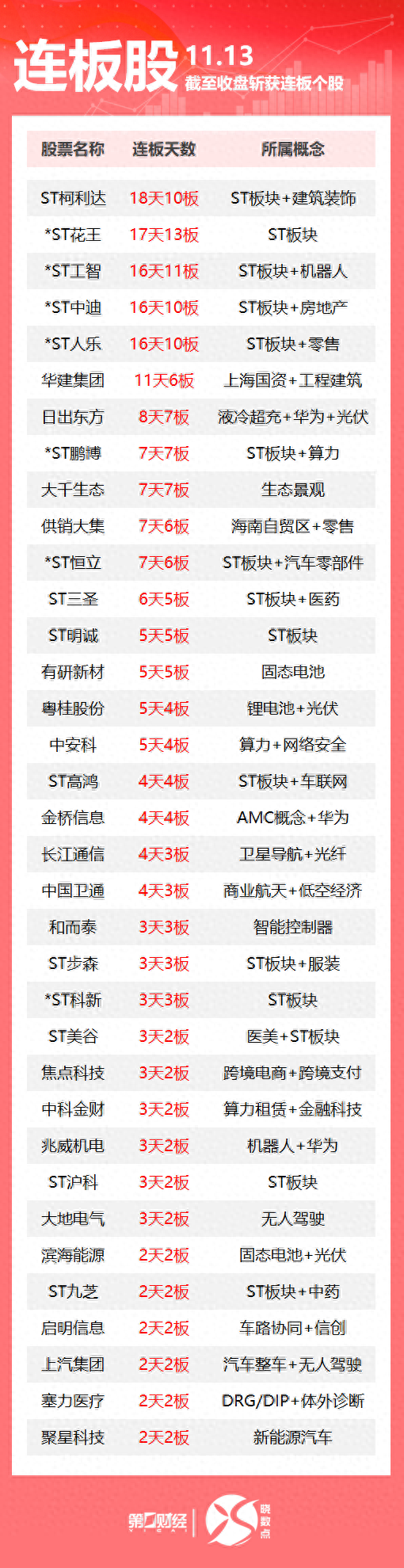 11月13日,数据显示,A股市场共计89只个股涨停。其中大千生态收获7连板,固态电池概念股有研新材5连板,商业航天概念股中国卫通4天3板,汽车股上汽集团2连板。一图速览今日连板股>>