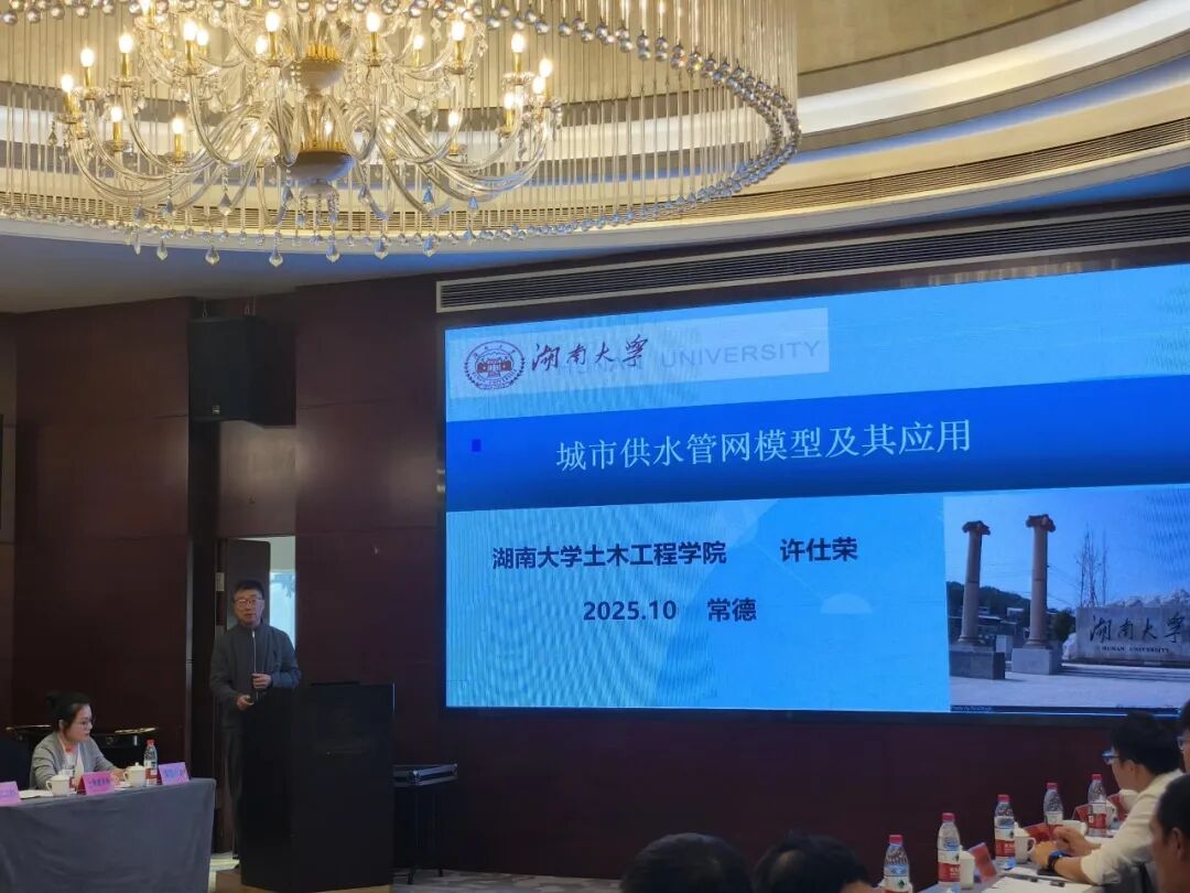 学术界代表、湖南大学许仕荣教授以《城市供水管网模型及其应用》为题分享。他深耕管网模拟与优化领域,曾改进算法提升模型精度,还研究漏损压力变化、监测点优化等技术。会上,他详细拆解水力模型的构建与应用,阐释如何通过模型实现管网 “可视、可算、可调”,达成安全供水与经济运行目标,为企业提供理论与技术指引。