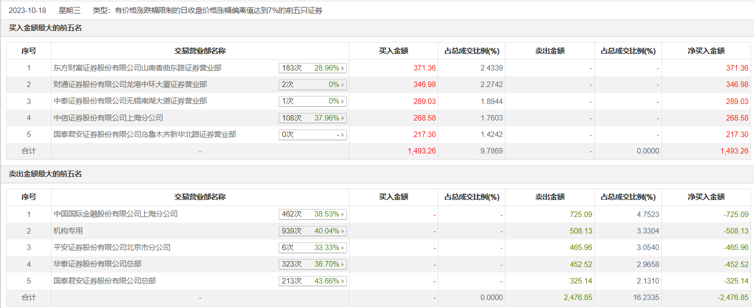 哈森股份10月18日涨停,全天换手率达6.89%,振幅达11.61%。龙虎榜数据显示,营业部席位合计净卖出983.59万元。其中,机构合计净卖出508.13万元。此外,东方财富证券山南香曲东路证券营业部、财通证券龙港中环大厦证券营业部分别买入371.36万元、346.98万元;中国国际金融上海分公司、平安证券北京市分公司分别卖出725.09万元、465.96万元。