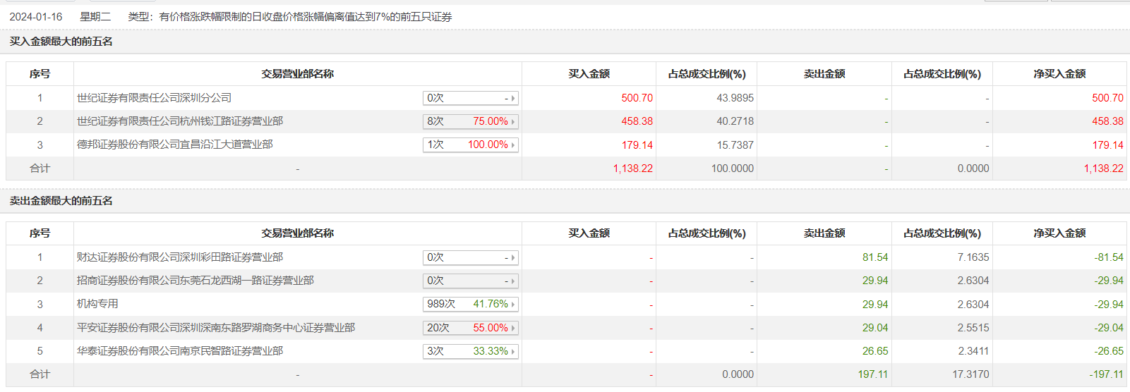 哈森股份1月16日涨停,全天换手率达0.52%,振幅达0%。龙虎榜数据显示,营业部席位合计净买入941.11万元。其中,机构合计净卖出29.94万元。此外,世纪证券深圳分公司、世纪证券杭州钱江路证券营业部分别买入500.70万元、458.38万元;财达证券深圳彩田路证券营业部、招商证券东莞石龙西湖一路证券营业部分别卖出81.54万元、29.94万元。