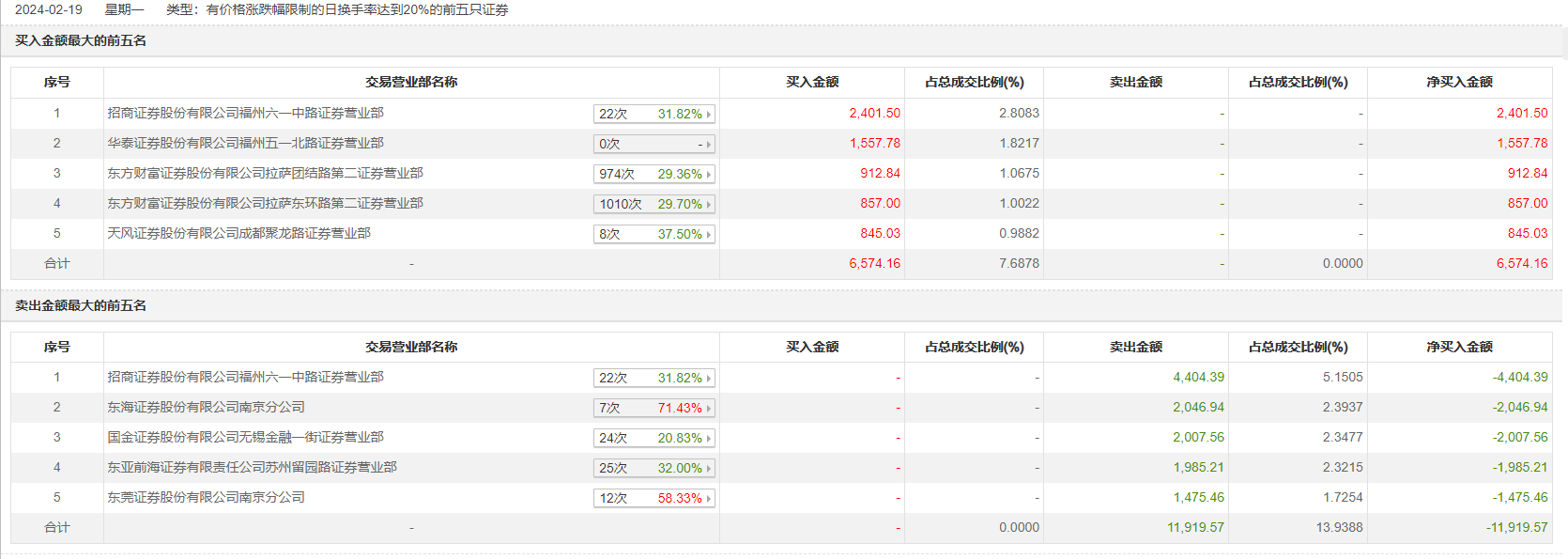 具体来看,招商证券福州六一中路证券营业部、华泰证券福州五一北路证券营业部分别买入2401.50万元、1557.78万元;招商证券福州六一中路证券营业部、东海证券南京分公司分别卖出4404.39万元、2046.94万元。