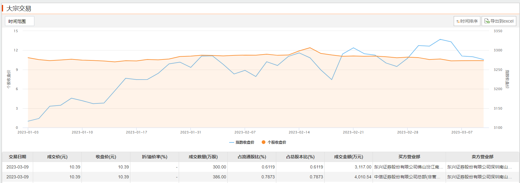 3月9日大宗交易成交686万股,成交额7127.54万元,占当日总成交额的64.65%,成交价10.39元,较市场收盘价10.39元持平。
