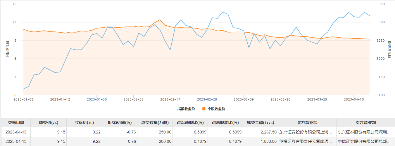 4月13日大宗交易成交450万股,成交额4117.5万元,占当日总成交额的44.89%,成交价9.15元,较市场收盘价9.22元折价0.76%。