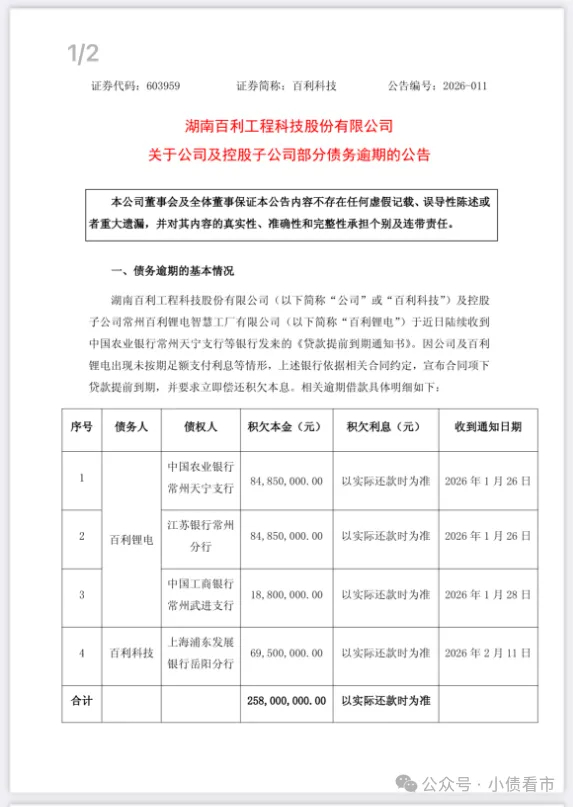 公告显示,根据相关逾期借款具体明细,百利科技积欠本金合计约2.58亿元,积欠利息以实际还款时为准。