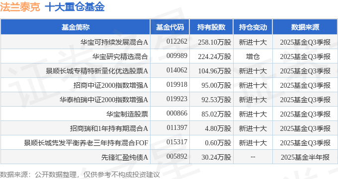 持有法兰泰克最多的基金为华宝可持续发展混合A,目前规模为5.12亿元,最新净值1.0183(10月29日),较上一交易日上涨1.57%,近一年上涨29.72%。该基金现任基金经理为贺喆。