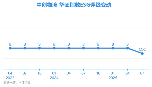 日前,华证指数公布了新一期(2025年7月31日)的ESG评级结果,中创物流(603967.SH)获得CCC评级(华证指数评级为C起至AAA九档,C为最低档,AAA为其最高一级评级/AA为其第二档),上一期(2025年4月30日)ESG评级为B。本期ESG评级在34家航空货运与物流行业A股上市公司中排名第27(上一期排名第28)。