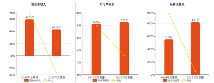 公司营业总收入为66.04亿元,较去年同报告期营业总收入减少25.48亿元,同比较去年同期下降27.84%。归母净利润为2.07亿元。经营活动现金净流入为4.71亿元。