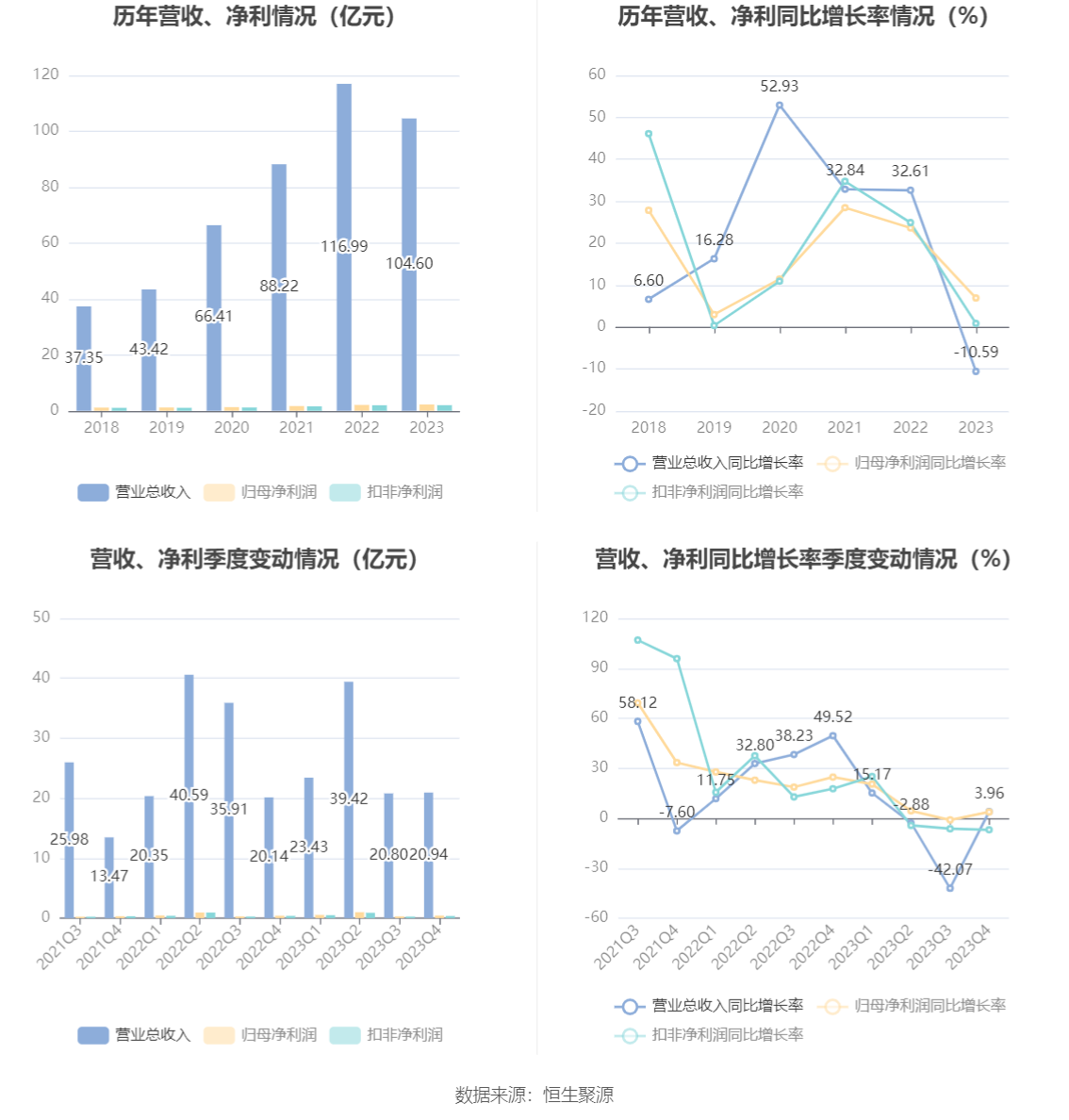 2023年,公司期间费用为4.14亿元,同比增长3375.31万元;期间费用率为3.96%,同比增长0.71个百分点。其中,销售费用同比增长8.98%,管理费用同比增长7.49%,研发费用同比增长42.76%,财务费用同比下降28.15%。