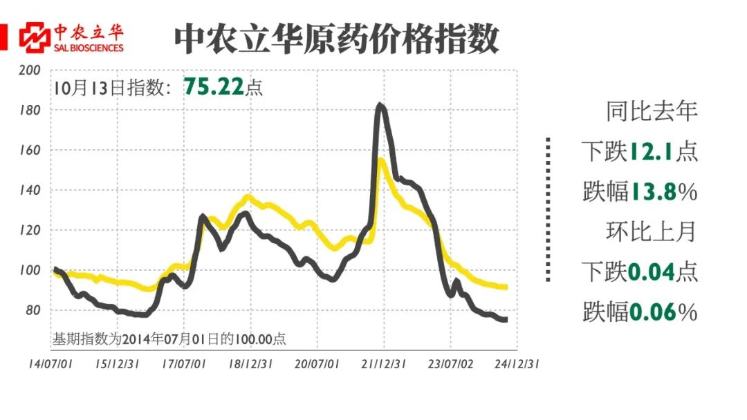 2024年10月13日,中农立华原药价格指数报75.22点,同比去年下跌13.8%,环比上月下跌0.06%。跟踪的上百个产品中,同比去年67%产品下跌;环比上月85%产品持平,6%产品上涨。