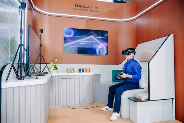 可完全放平变为睡床的座椅、智能灯光系统、24英寸4K超高清屏幕,加上蓝牙音讯功能,这就是国泰航空推出的“尔雅”公务舱。本次进博会,国泰航空通过VR技术,在展台还原了“尔雅”公务舱。观众可以佩戴VR眼镜沉浸式“环顾”这个私密空间,感受万米高空上的舒适体验。国泰集团中国内地董事郑家驹介绍,国泰航空于2024年推出的尔雅公务舱,受到旅客良好反馈,未来将在更多长途航线上配置尔雅公务舱。