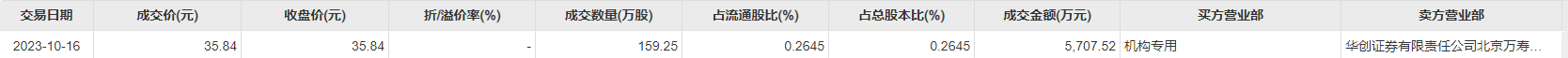 今日大宗交易成交159.25万股,成交额5707.52万元,占当日总成交额的32.41%,成交价35.84元,较市场收盘价持平。