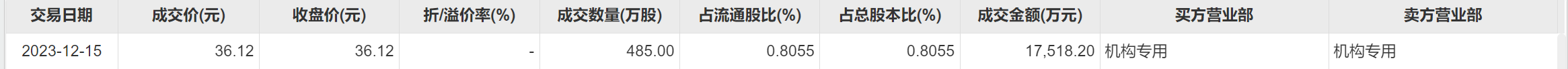 今日大宗交易成交485万股,成交额1.75亿元,占当日总成交额的51.27%,成交价36.12元,较市场收盘价持平。