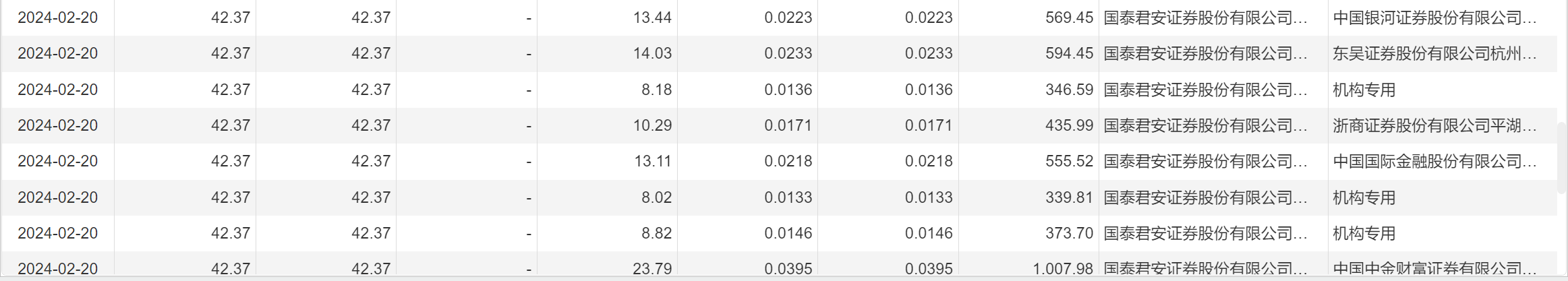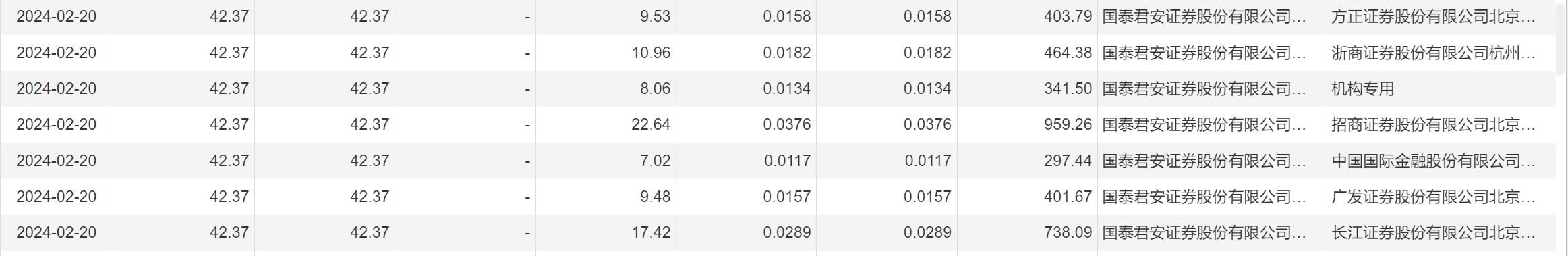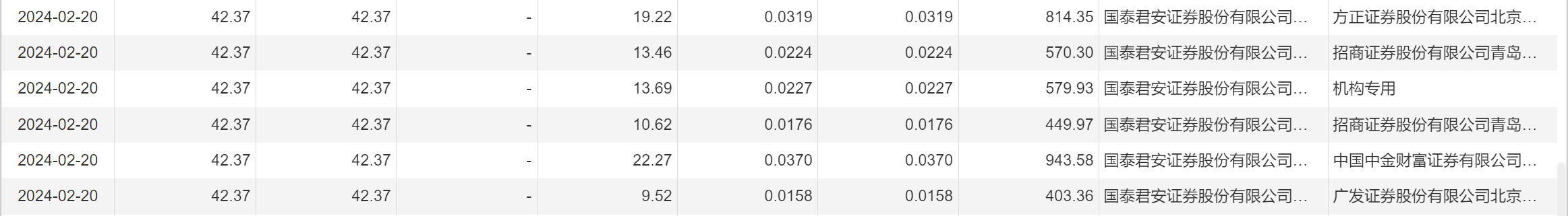 2月20日大宗交易成交462.75万股,成交额1.96亿元,占当日总成交额的47.23%,成交价42.37元,较市场收盘价42.37元持平。