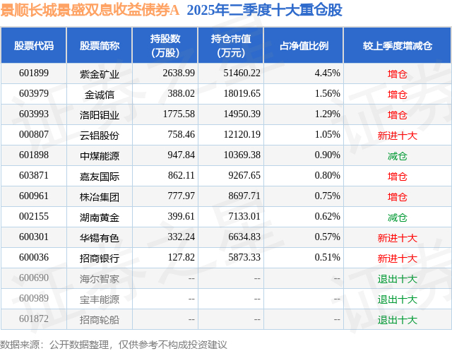 根据2025基金半年报公募基金重仓股数据,重仓该股的公募基金共91家,其中持有数量最多的公募基金为景顺长城基金的景顺长城景盛双息收益债券A。景顺长城景盛双息收益债券A目前规模为105.57亿元,最新净值1.231(10月9日),较上一交易日上涨0.82%,近一年上涨10.01%。该公募基金现任基金经理为李怡文 邹立虎 李曾卓卓。李怡文在任的基金产品包括:景顺长城景颐双利债券A,管理时间为2021年4月30日至今,期间收益率为24.47%;景顺景颐招利6个月持有期债券A,管理时间为2021年4月30日至今,期间收益率为32.89%;景顺长城安泽回报一年持有混合A,管理时间为2021年4月30日至今,期间收益率为39.15%;景顺景颐嘉利6个月持有期债券A,管理时间为2021年6月16日至今,期间收益率为22.73%。邹立虎在任的基金产品包括:景顺长城安盈回报一年持有混合A,管理时间为2021年11月16日至今,期间收益率为42.36%;景顺景颐招利6个月持有期债券A,管理时间为2022年3月12日至今,期间收益率为25.36%;景顺长城华城稳健6个月持有期混合A,管理时间为2022年3月12日至今,期间收益率为28.98%。