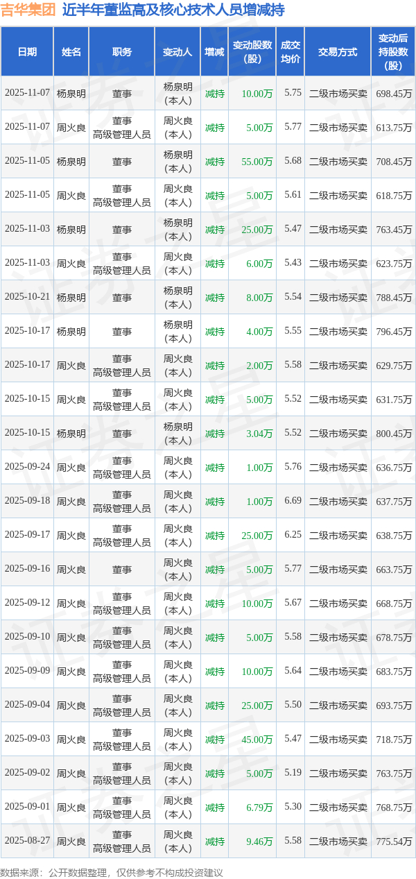 吉华集团近半年内的董监高及核心技术人员增减持详情如下: