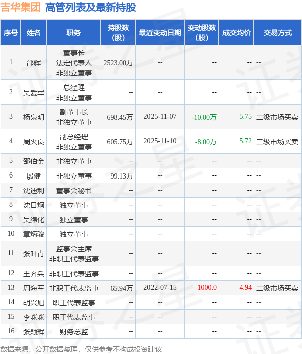 吉华集团:11月19日高管杨泉明、周火良减持股份合计10万股
