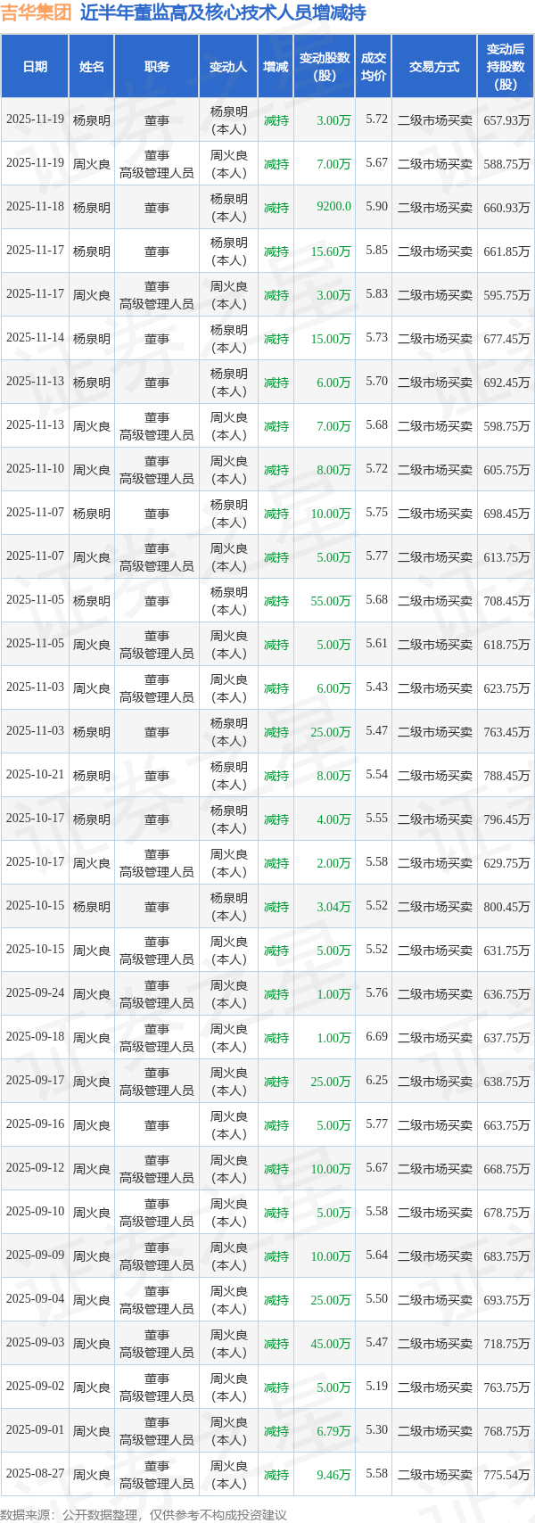 吉华集团近半年内的董监高及核心技术人员增减持详情如下: