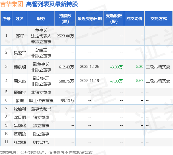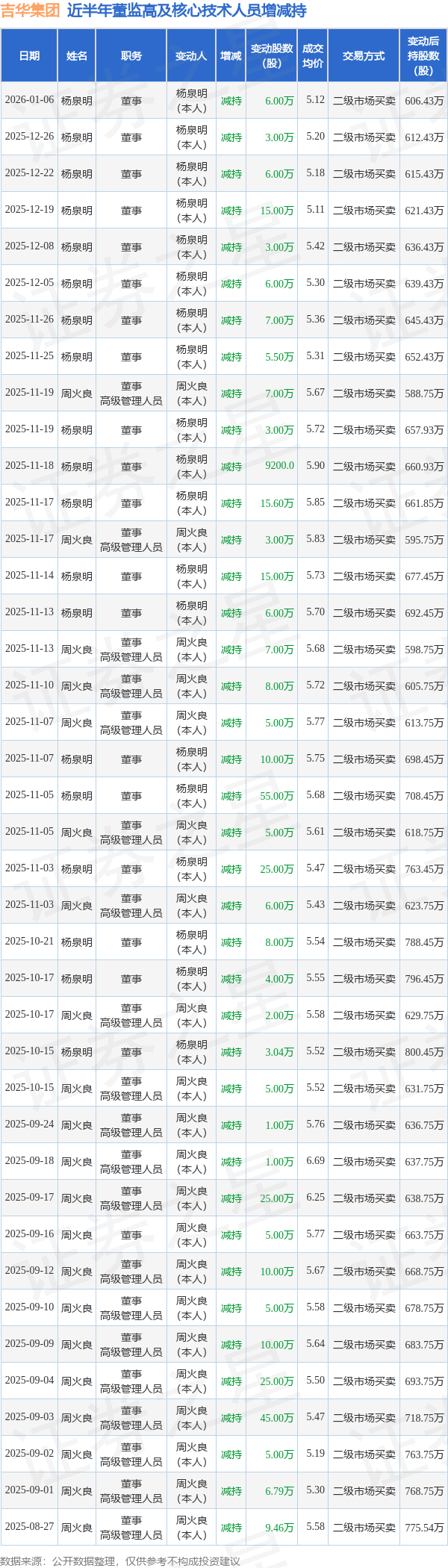 吉华集团近半年内的董监高及核心技术人员增减持详情如下: