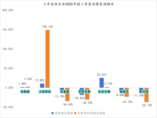 向来是高增长代表的珀莱雅,其1-9月营收同比增长1.89%至70.98亿元,归母净利润同比增长2.65%至10.26亿元。贝泰妮、华熙生物、福瑞达、敷尔佳均出现不同程度的营收下滑,而处于转型期的上海家化、丸美生物,则实现了逆势增长。
