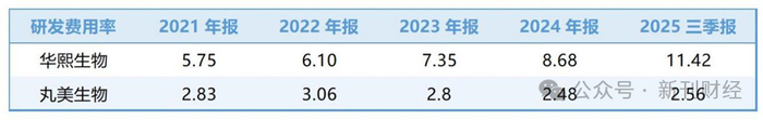 丸美生物的合规危机不仅体现在财务核算上,更深层次地反映了其“重营销轻研发”的业务模式缺陷。从研发投入与营销投入的对比来看,丸美生物长期处于失衡状态。2025年前三季度,公司研发费用仅为0.63亿元,同比增长15.3%,而同期销售费用高达14.15亿元,同比增长32.09%。销售费用是研发费用的22倍以上,且销售费用增速持续高于营收增速(25.51%)。这种投入失衡在国货美妆行业中十分罕见。从历史数据来看,丸美生物的研发投入长期处于低位。2021-2024年,公司的研发费用率水平一直徘徊在2.48%-3.06%之间,相比之下,华熙生物2025年前三季度研发费用率达11.42%,其他时期的数据也均显著高于丸美生物。