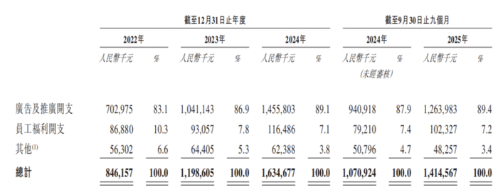 报告期内,丸美生物的广告及推广开支分别7.03亿元、10.41亿元、14.56亿元及12.64亿元,合计44.64亿元。