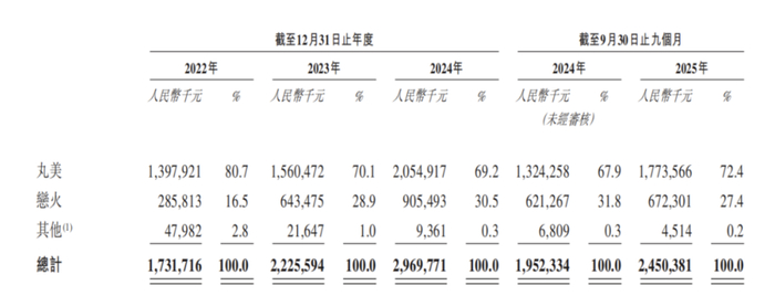 “丸美”是公司收入的主力,2022年-2024年及2025年前9个月(下称“报告期”),丸美品牌收入分别为14亿、15.6亿、20.5亿及17.7亿,贡献占比80.7%、70.1%、69.2%及72.4%。其中,面部类产品占总收入的50%左右。