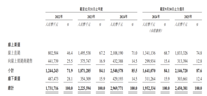从销售渠道来看,丸美生物通过天猫、京东、抖音等线上渠道的收入占比,在2025年前9个月高达87.6%;而日化化妆品专营店、百货商场专柜及美容院等线下渠道则持续收缩,收入占比从期初的28.1%降至期末的12.4%。