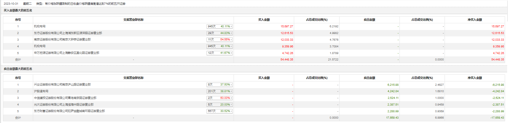 10月31日,恒润股份今日跌停,全天换手率达13.52%,振幅达7.65%。龙虎榜数据显示,营业部席位合计净买入3.68亿元。其中,机构合计净买入2.51亿元。此外,兴业证券南京庐山路证券营业部、沪股通专用分别卖出6215.98万元、4242.84万元;东方证券上海浦东新区源深路证券营业部、小鳄鱼(南京证券南京大钟亭证券营业部)分别买入1.26亿元、1.2亿元。
