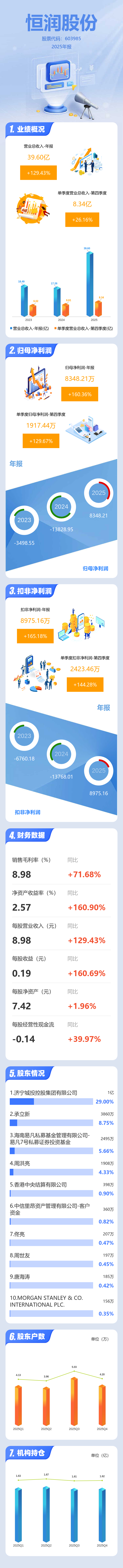 证券之星消息,恒润股份2025年年报显示,当年度公司主营收入39.6亿元,同比上升129.43%;归母净利润8348.21万元,同比上升160.37%;扣非净利润8975.16万元,同比上升165.19%;其中2025年第四季度,公司单季度主营收入8.34亿元,同比上升26.17%;单季度归母净利润1917.44万元,同比上升129.68%;单季度扣非净利润2423.46万元,同比上升144.29%;负债率42.6%,投资收益151.06万元,财务费用2828.34万元,毛利率8.98%。