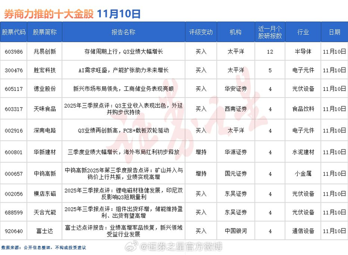 除了上述个股外,还有天味食品、深南电路、华新建材、中钨高新、横店东磁、天合光能、富士达等多股备受券商关注。