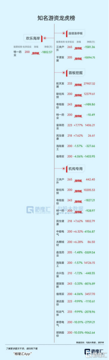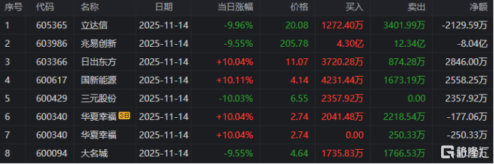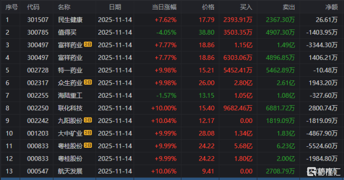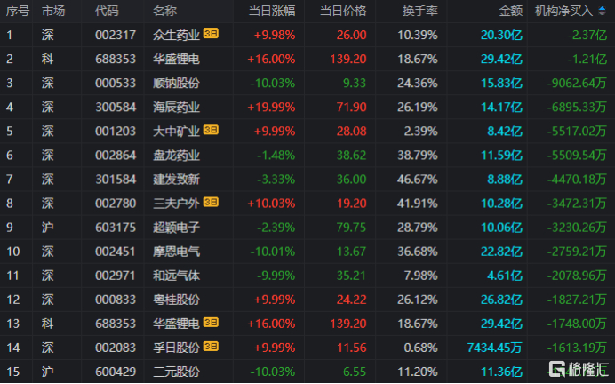 龙虎榜中涉及机构专用席位的个股中,单日净卖出额前三为华盛锂电、顺钠股份、海辰药业,分别为卖出1.21亿、9062.64万、6895.33万。