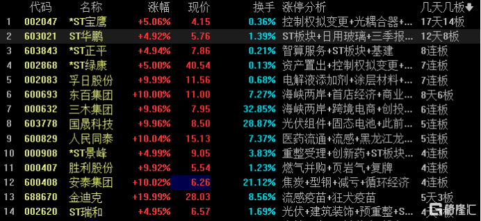 高位股方面,ST圣鹰7天14板,ST华鹤12天8板,ST正平8连板,ST绿康7连板,东百集团7连板,孚日股份6连板,三木集团6连板,国晟科技5连板,人民同泰5连板,ST景峰、胜利股份、安迪集团、金通灵4连板,ST瑞和3天3板。
