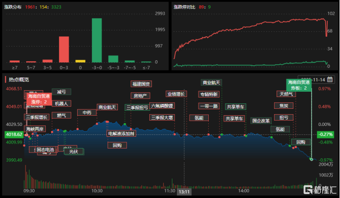 11月14日,A股三大指数集体走低,截至收盘,沪指跌0.97%报3990点,深证成指跌1.93%,。全市场成交额1.98万亿元,较前一交易日缩量853亿元,逾3300股下跌。存储芯片、HBM概念/半导体等板块跌幅居前。海南板块、燃气股、水产养殖等板块涨幅居前。