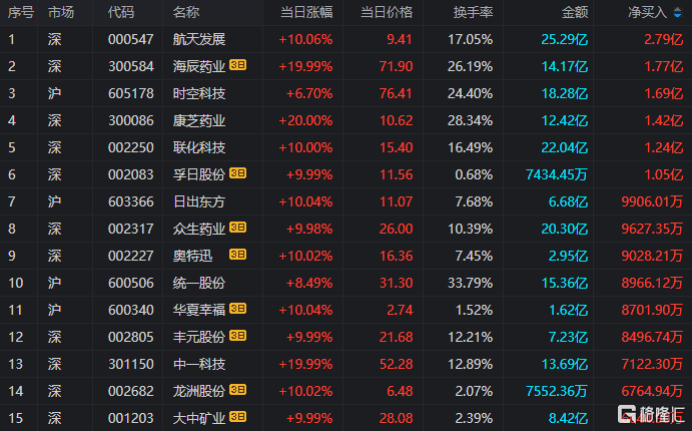 龙虎榜单日净买入额前三为航天发展、时空科技、康芝药业,分别为2.79亿、1.69亿、1.42亿。