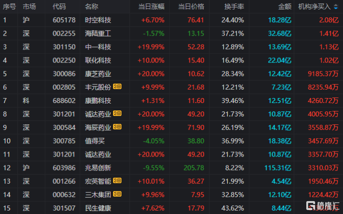 龙虎榜中涉及机构专用席位的个股中,单日净买入额前三为时空科技、海陆重工、中一科技,分别为卖出2.08亿、1.41亿、1.13亿。