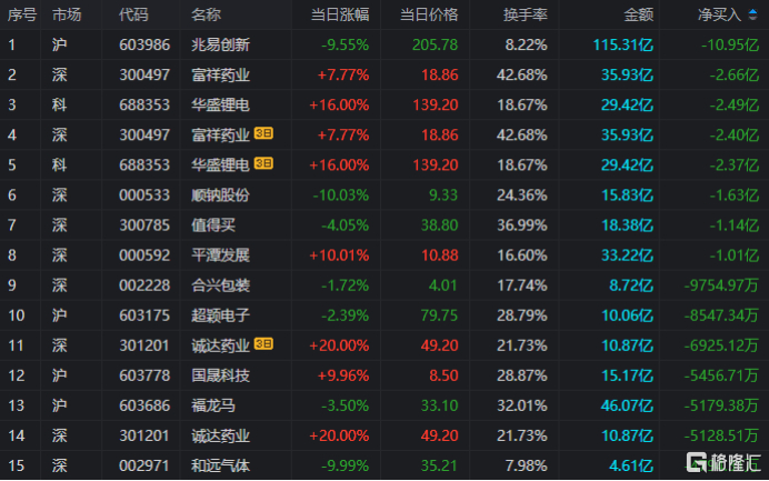 龙虎榜单日净卖出额前三为兆易创新、富祥药业、华盛锂电,分别为10.95亿、2.66亿、2.49亿。