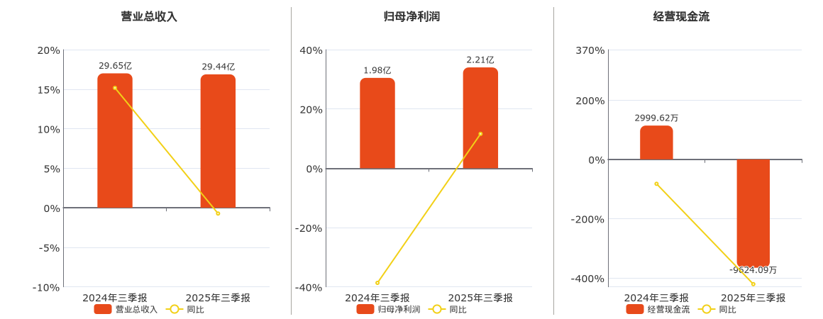 公司营业总收入为29.44亿元,较去年同报告期营业总收入减少2160.80万元,同比较去年同期下降0.73%。归母净利润为2.21亿元。经营活动现金净流入为-9624.09万元,在已披露的同业公司中排名第56,较去年同报告期经营活动现金净流入减少1.26亿元,同比较去年同期下降420.84%。