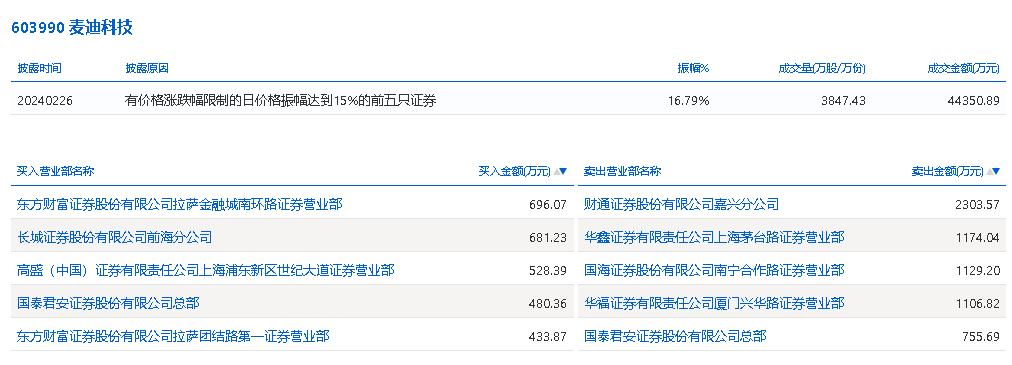 2月26日,麦迪科技今日跌4.67%,龙虎榜数据显示,上榜营业部席位全天成交9289.24万元,占当日总成交金额比例为20.94%。其中,买入金额为2819.92万元,卖出金额为6469.32万元,合计净卖出3649.4万元。