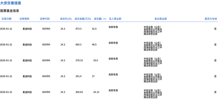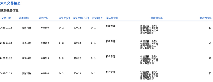 1月12日,麦迪科技大宗交易成交215.13万股,成交额3054.85万元,占当日总成交额的5.62%,成交价14.2元,较市场收盘价16.05元折价11.53%。