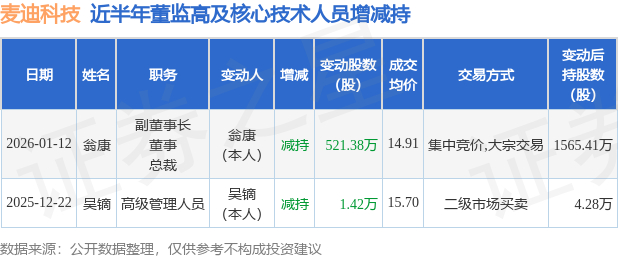 麦迪科技近半年内的董监高及核心技术人员增减持详情如下: